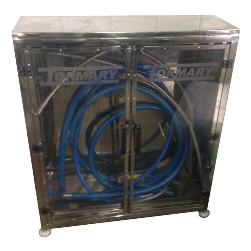 - Armários para guardar mangueiras com rodas, dreno e bandeja;