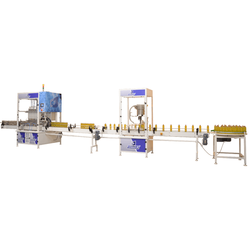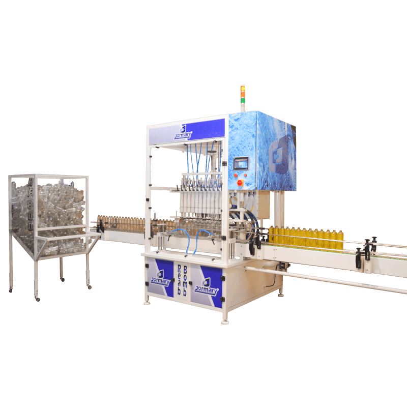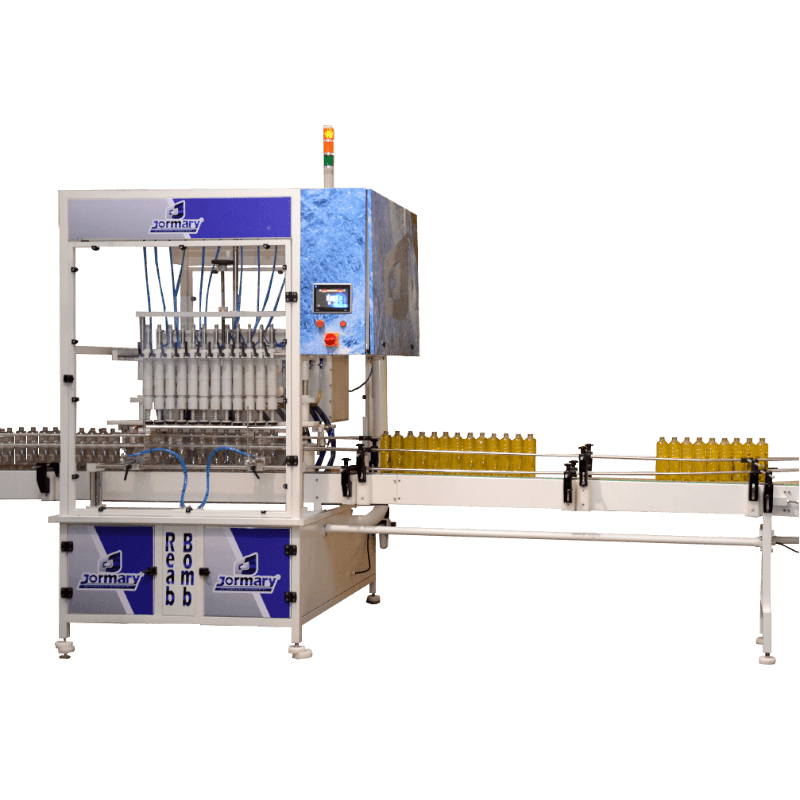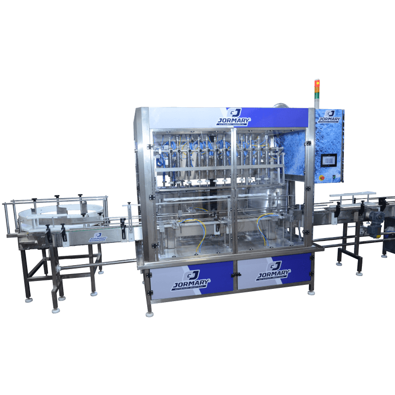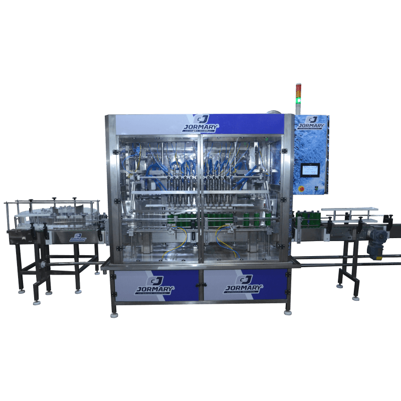 Dispositivo centralizador de frascos automático e posicionamento dos bicos é feito de forma automática, isto é, no setup dos frascos, a parte vertical do sobe e desce, busca a altura do frasco em relação ao gargalo automaticamente, o que é total exclusividade Jormary.