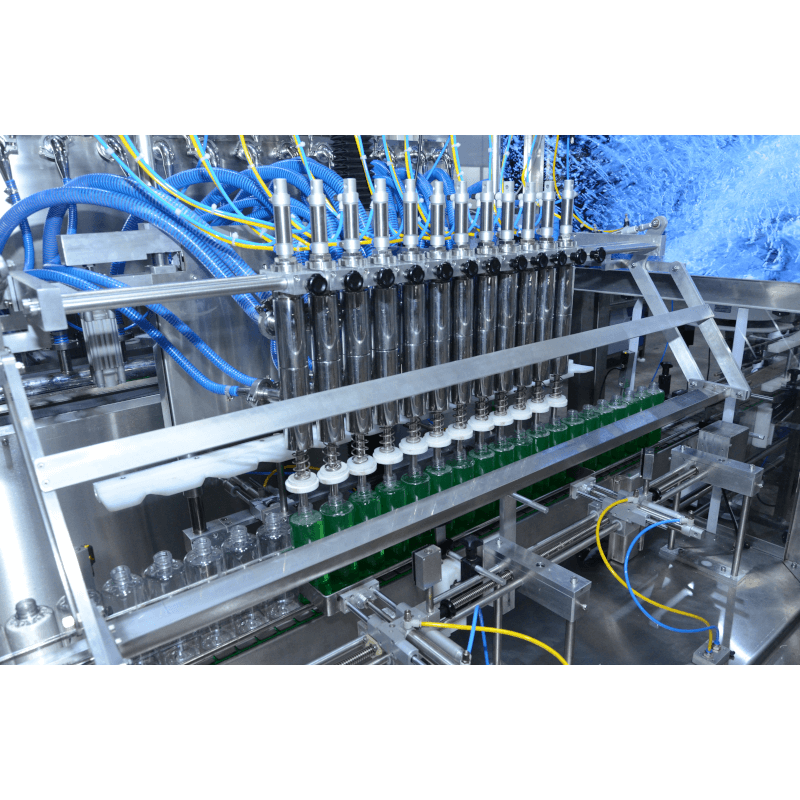 Envasadora automática com processo de envase por pressão positiva, construída em aço inox pintado com tinta especial anticorrosiva, preparada para envase de produtos espumosos e corrosivos, e com vedações especiais que suportam ataques químicos.