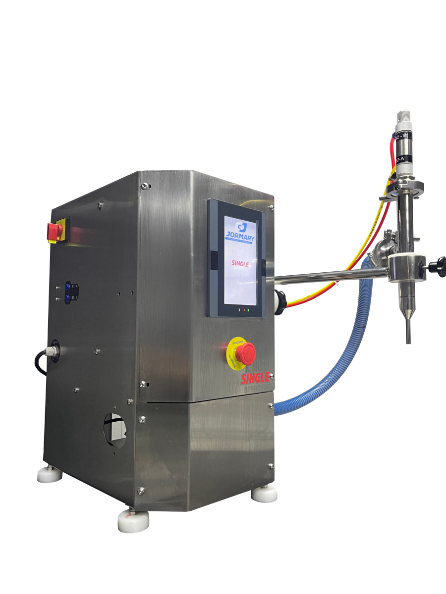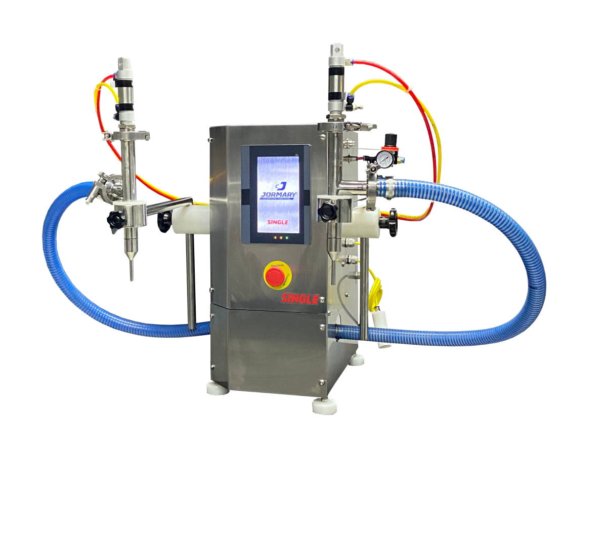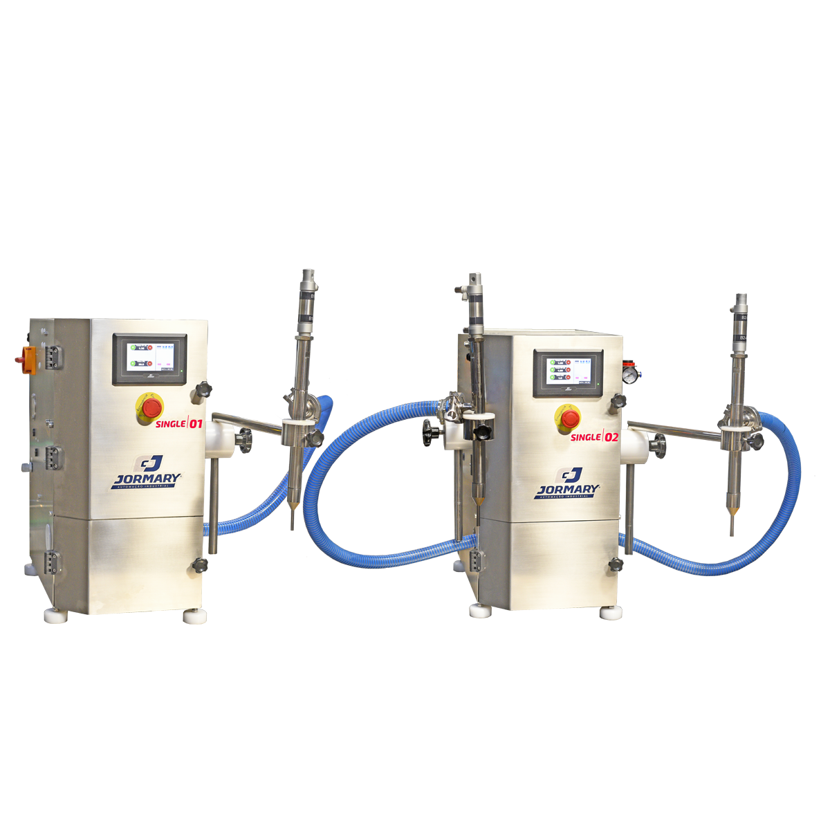 A envasadora semiautomática SINGLE opera por pressão positiva com dosador volumétrico exclusivo JORMARY fabricada em aço Inox 316L (com certificado) e vedações de viton (com certificado), o que lhe permite trabalhar com alta gama de produtos, inclusive com produtos químicos em altas temperaturas.( até 65  graus)