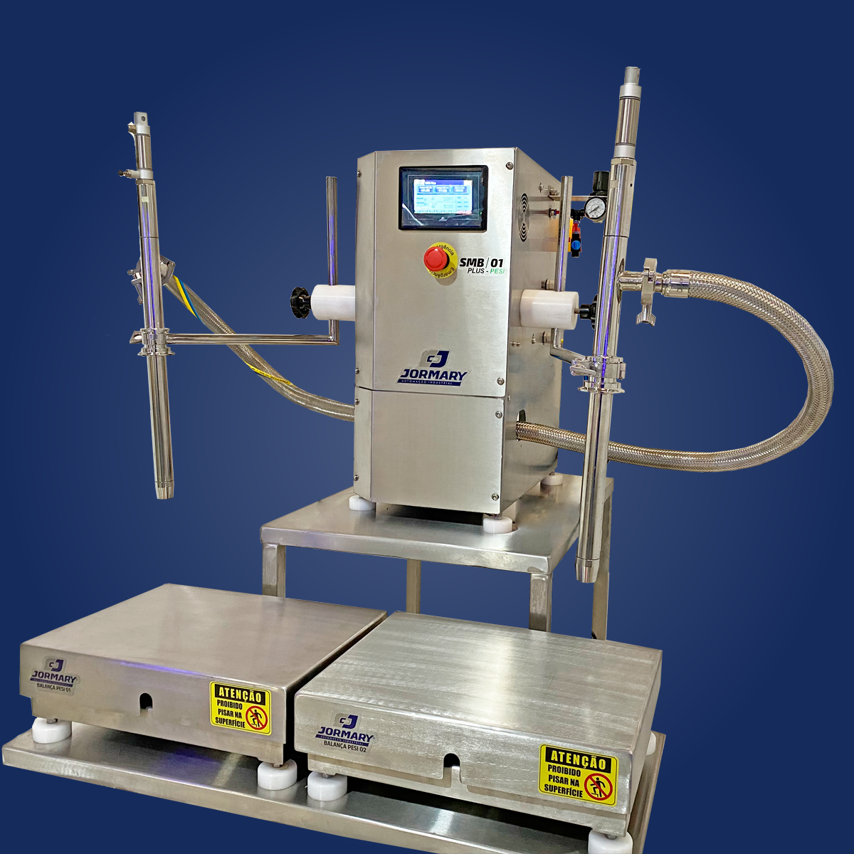 Envasadora semiautomática com corpo em inox 304 escovado, composta de 02 Válvulas de fechamento com corta gotas (bicos) ou uma Válvula de fechamento com corta gotas (bicos) e pressão de ar comprimido à 6 Kgf, dosador volumétrico e conexões TC em inox 316 (com certificado) totalmente sanitários obedecendo RDC, operando por pressão positiva com suas vedações em viton ou epdm ou silicone ou atóxica. Envasa produtos líquidos, semilíquidos e viscosos, além de produtos químicos em altas temperaturas (70º), suportando pressão interna tanto no dosador volumétrico quanto na tubulação e válvula de fechamento em até 10 Kgf em volumes de 10ml a 50.000 ml com precisão em diversos tipos de frascos, potes, bisnagas, garrafas, bags, Galões e bombonas. Vedações em silicone e selo mecânico O modelo SMB PUS PESI possibilita envasar volumétricamente e com checador de peso automático (balança automatizada) com seu sistema exclusivo de pesagem modelo PESI.