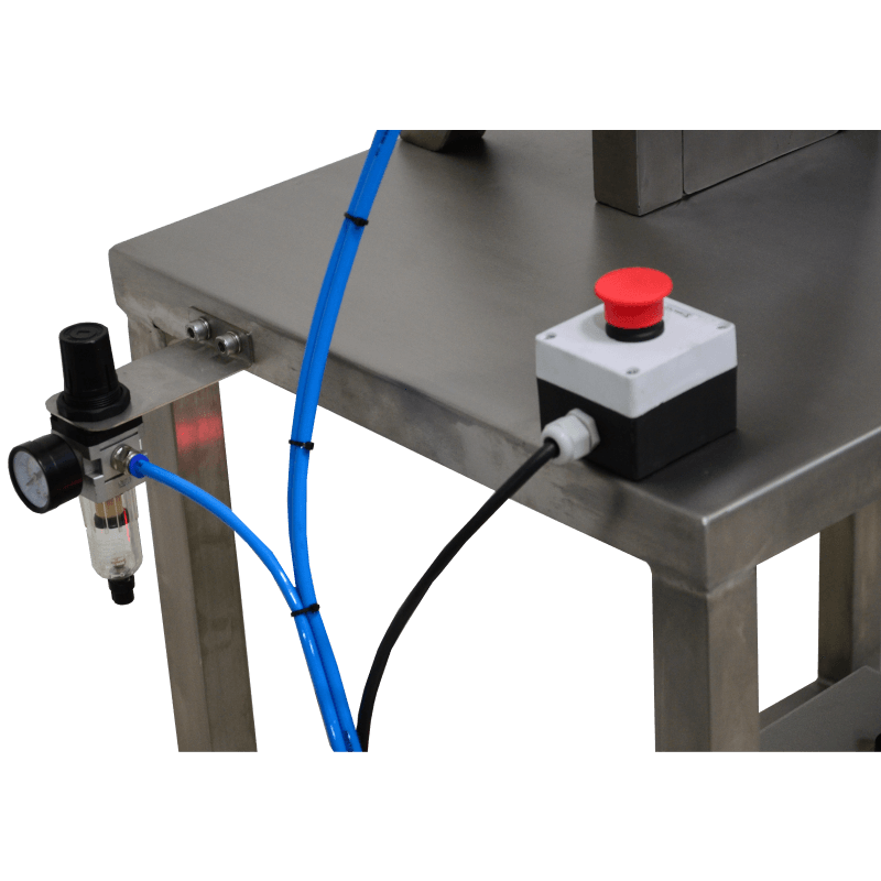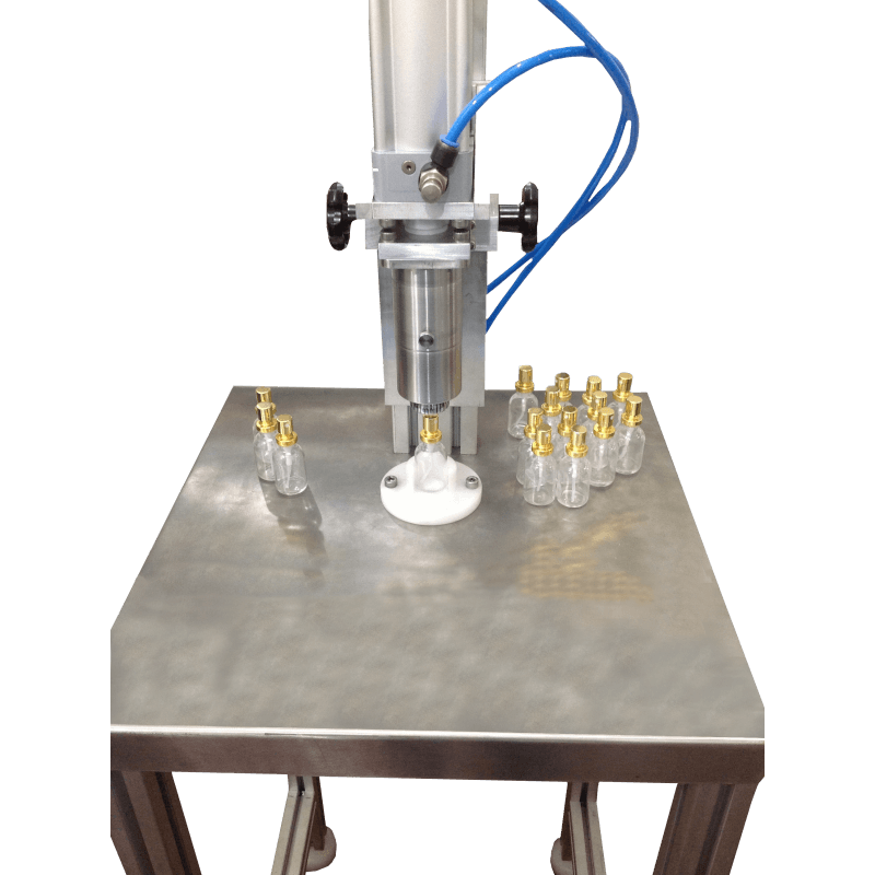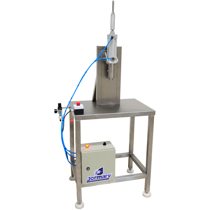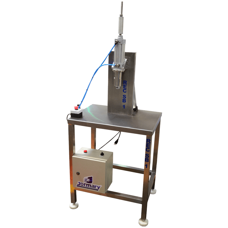 Essa recravadora é indicada para a recravação de frascos de vidro e PET. Equipada com sistema pneumático para subida e descida da pinça recravadora pelo acionamento de um comando por pedal.